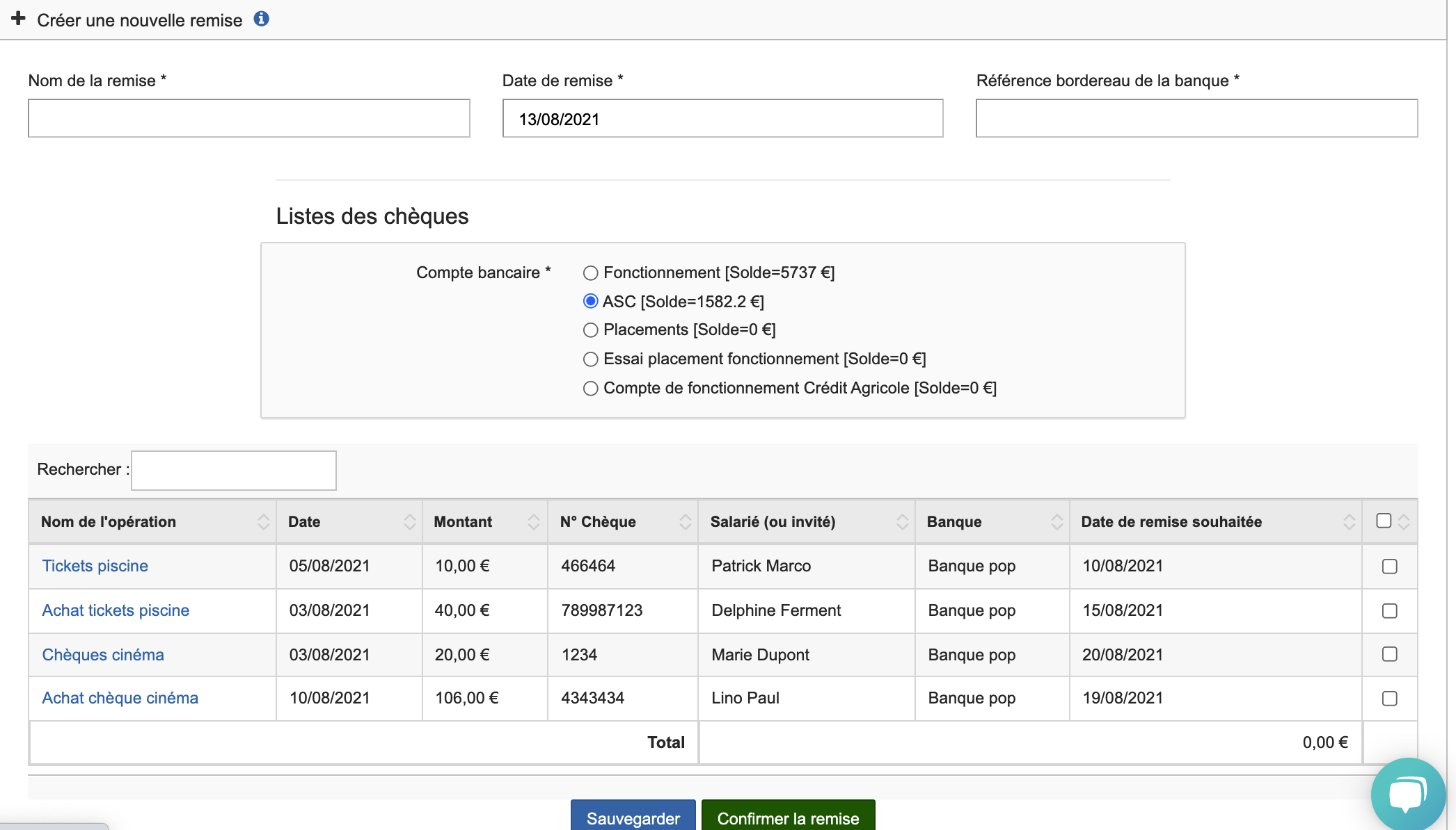 Nom de la remise * : indiquez le nom de la remise, (exemple remise chèques ASC de septembre 2021). Il s'agit d'une rubrique obligatoire.
