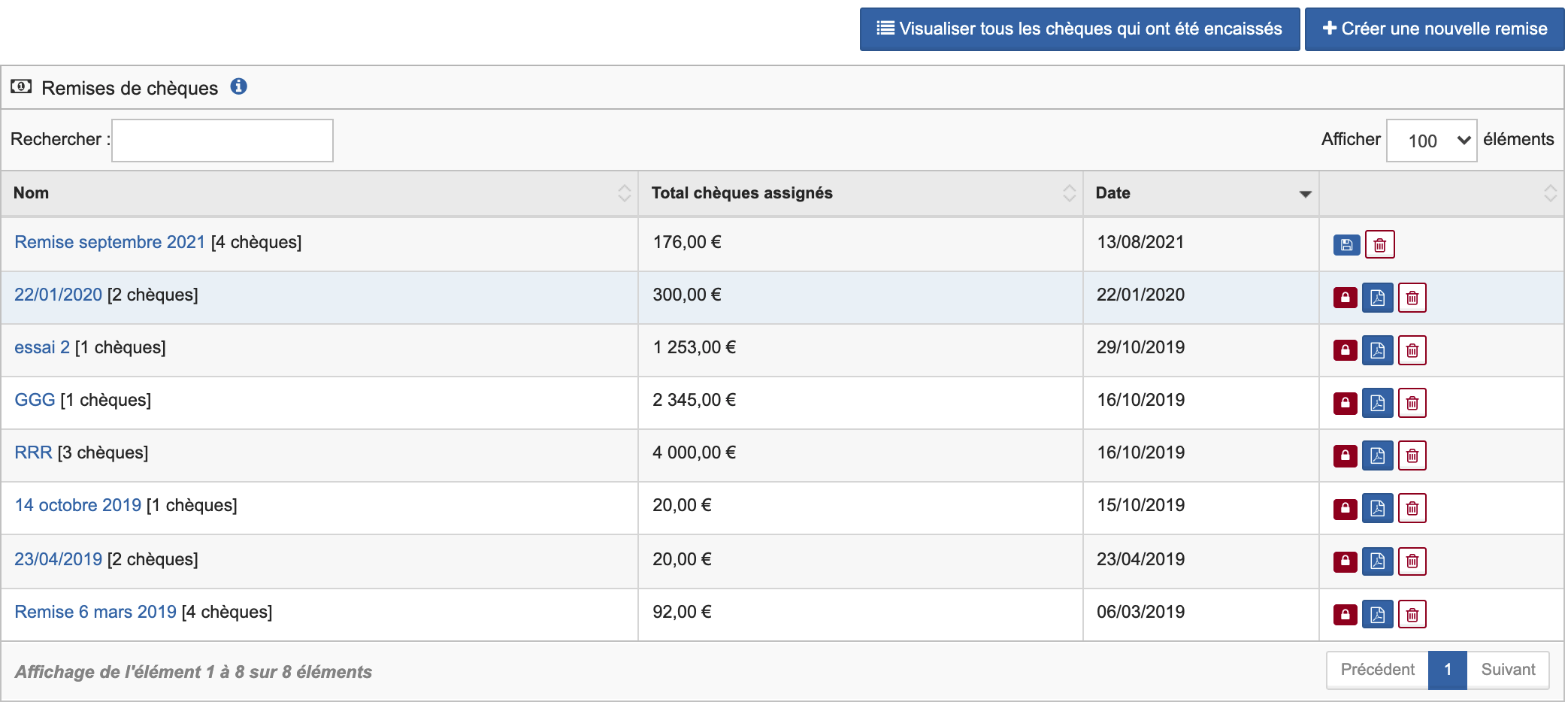 Cette fonction permet de visualiser l'ensemble des chèques encaissés afin de faire une vérification, une recherche.