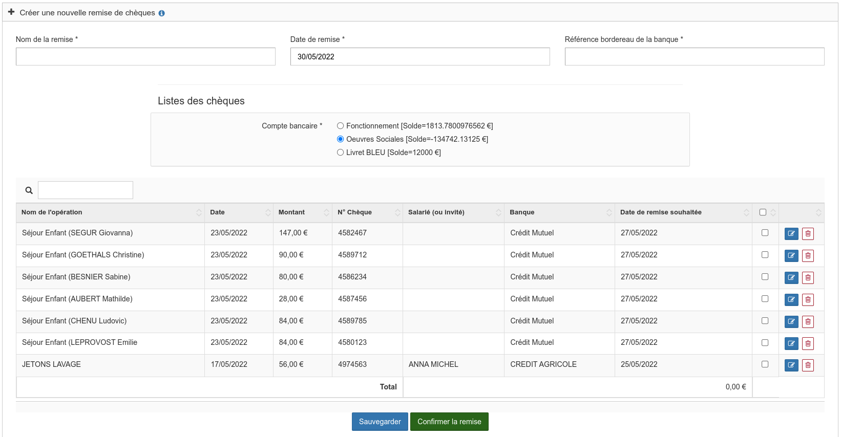 Nom de la remise * : indiquez le nom de la remise, (exemple remise chèques Œuvres Sociales de Mai 2022). Il s'agit d'une rubrique obligatoire.