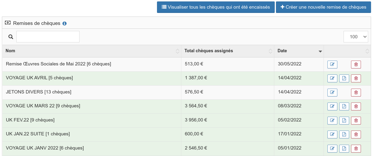 En sauvegardant, vous préparez le bordereau sans le générer, vous pouvez reprendre cette remise de chèque plus tard pour la modifier. Dans l'exemple, ci-dessous, il s'agit de la remise “Remise Œuvres Sociales de Mai 2022 [6 chèques]”, ou bien de “JETONS DIVERS [13 chèques]”, il est donc pour l'instant impossible de générer ces bordereaux en version imprimable.