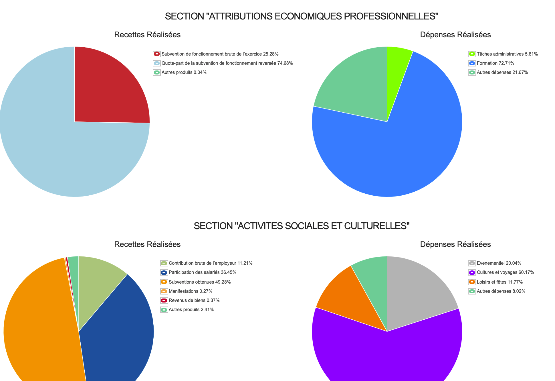 Dans la partie supérieure, vous trouvez la situation de votre budget de fonctionnement (renommé depuis quelques années en ATTRIBUTIONS ECONOMIQUES PROFESSIONNELLES) et dans la partie inférieure, la situation de votre budget des activités sociales.