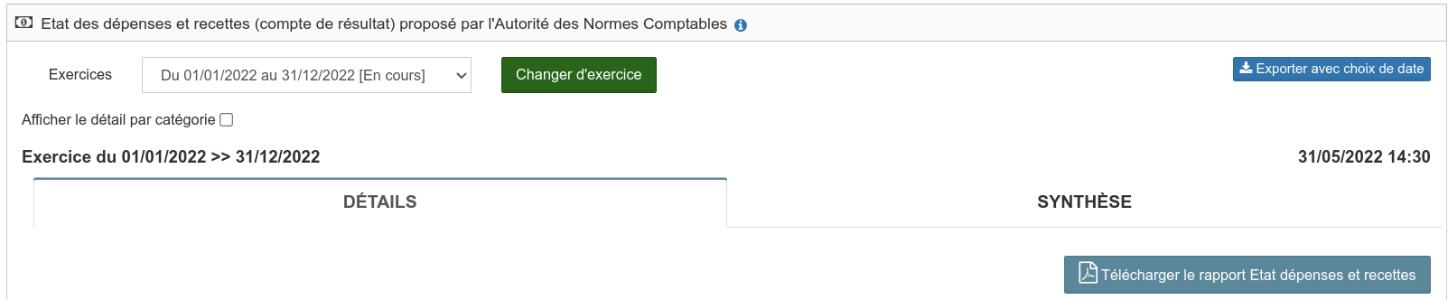 Vous pouvez télécharger et/ou imprimer vos états ( le détail et la synthèse) à partir du bouton “Télécharger le rapport Etat dépenses et recettes” :