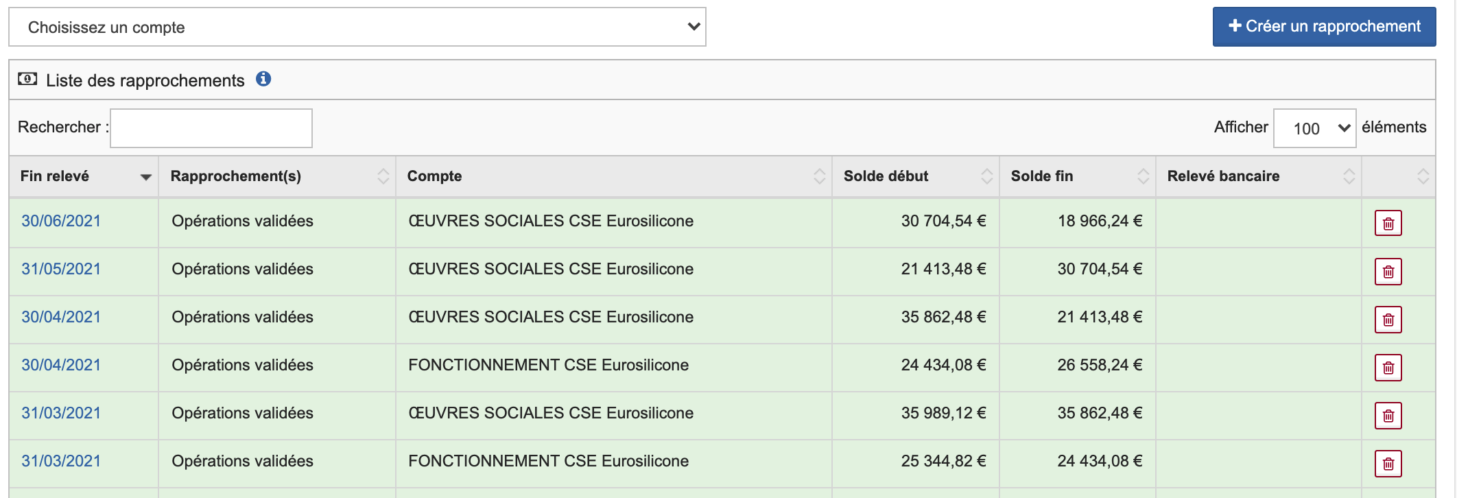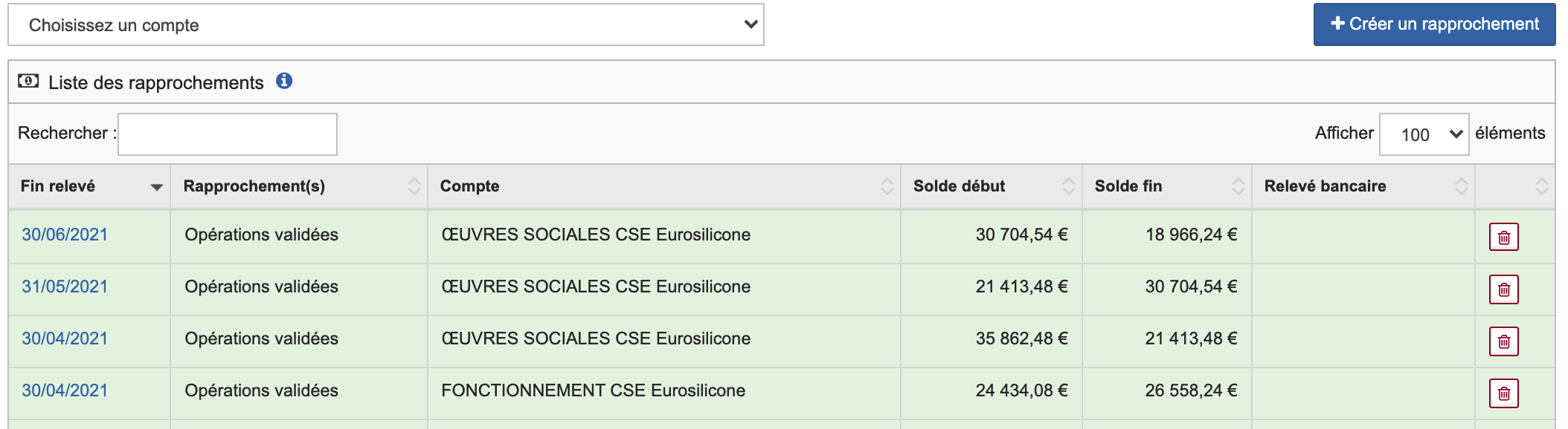A noter qu’un rapprochement validé ne peut plus être supprimé. Par contre vous pouvez supprimer un rapprochement non validé. Pour une meilleure lisibilité, les rapprochements validés apparaissent en couleur (ligne).