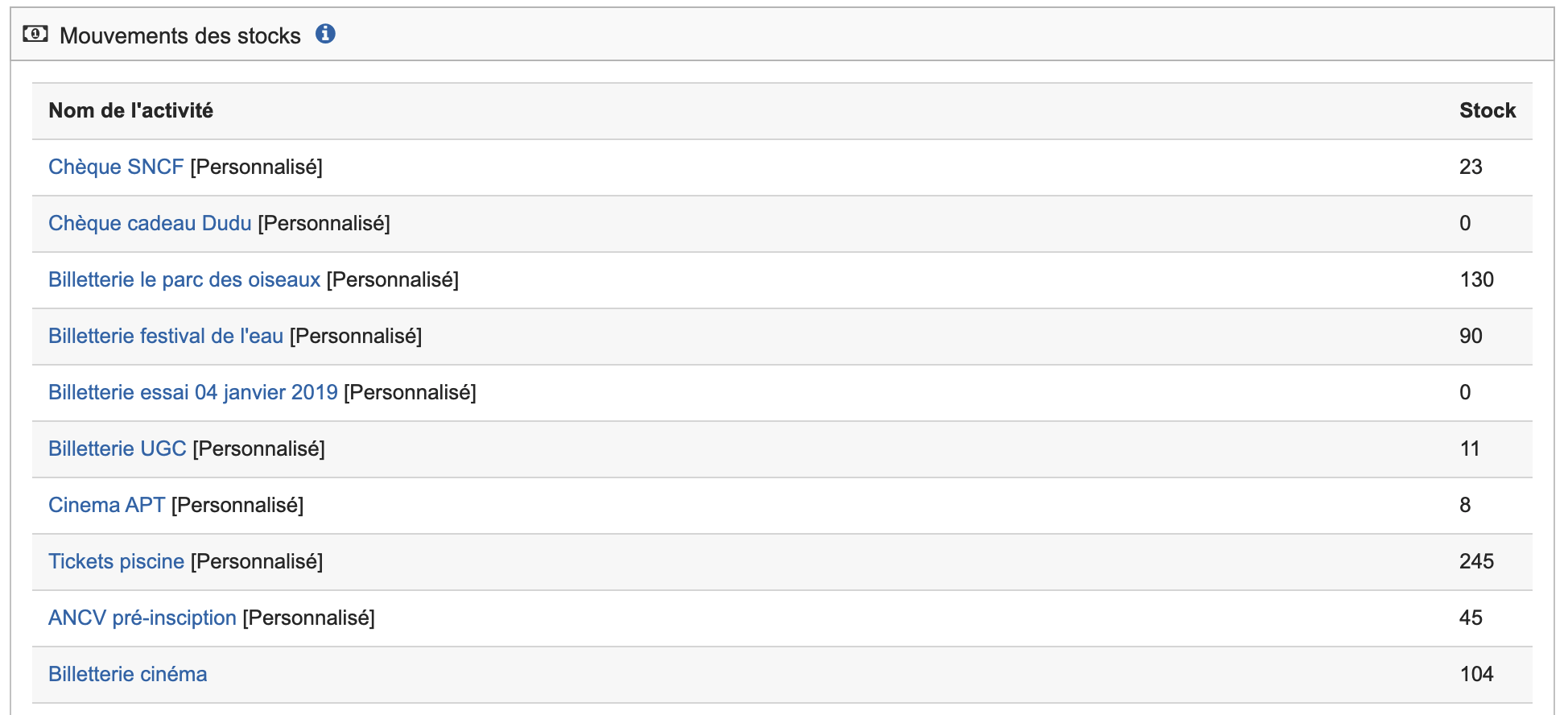 Il s'agit de la liste des activités pour lesquelles vous gérez un stock :
