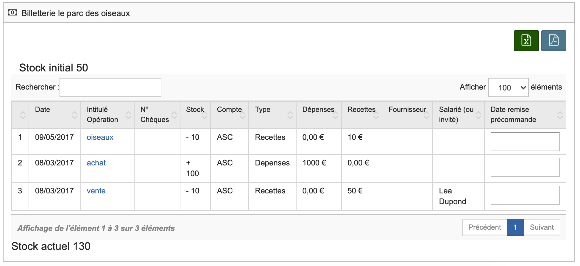 A l'aide des icônes suivants, vous pouvez éditer votre stock (Pdf ou Xls).